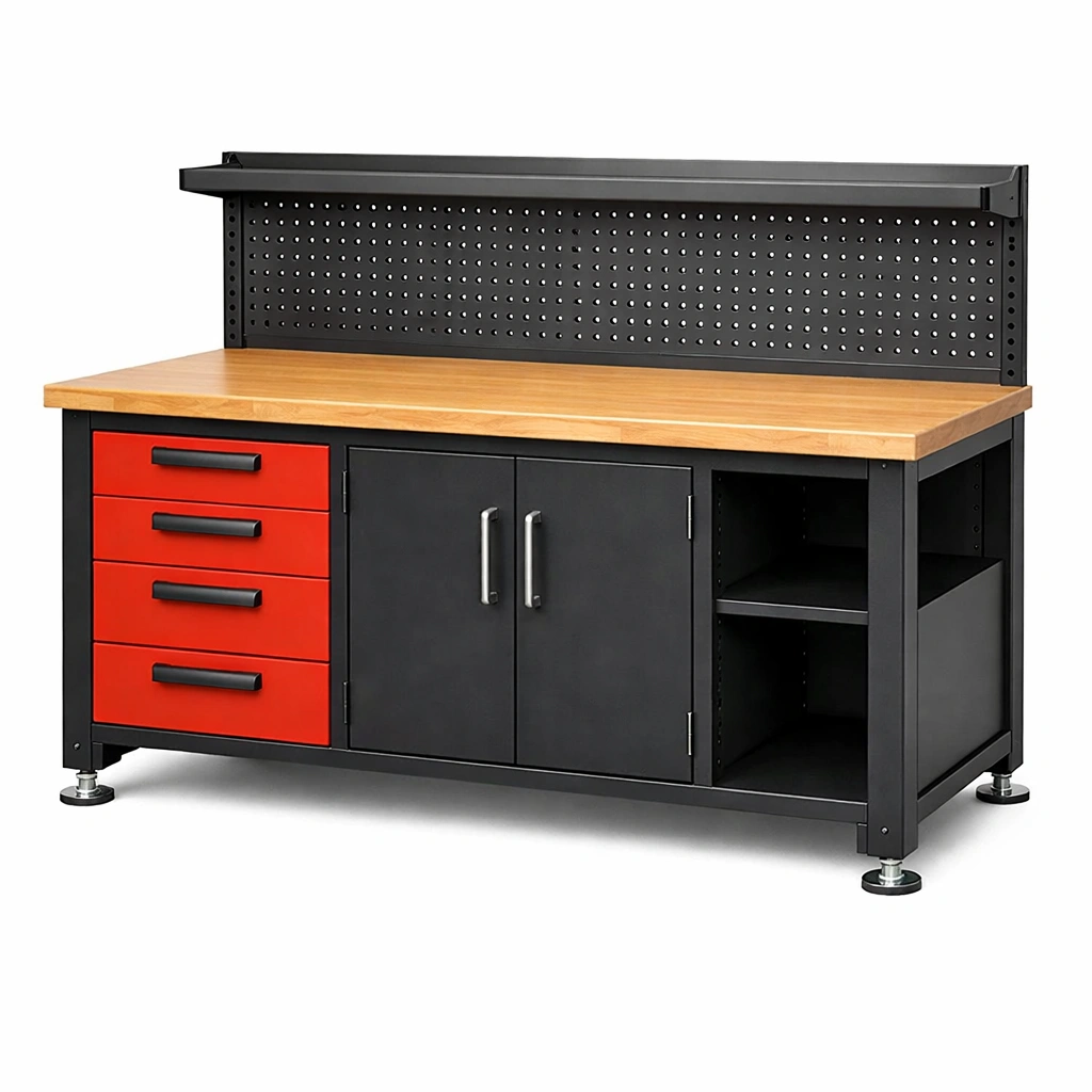 Diese Werkbank ist mit einer Tischplatte aus massivem Buchenholz ausgestattet. Der Rahmen besteht aus pulverbeschichtetem Stahl. Die Werkbank bietet vier Schubladen mit glatten Schienen und zwei Türen für geschlossenen Stauraum. Die Lochwand an der Rückseite ermöglicht eine flexible Organisation von Werkzeugen. Die maximale Traglast beträgt 150 kg.
