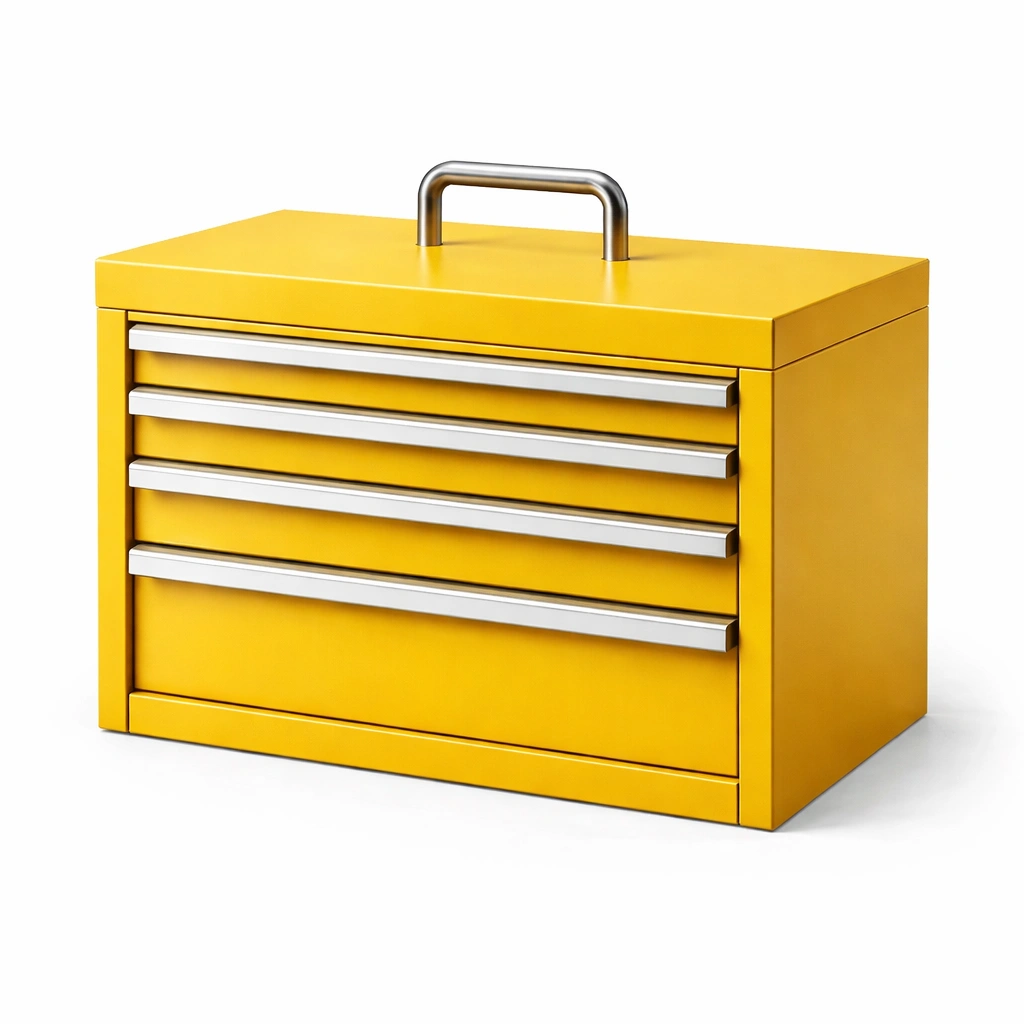 Der Werkzeugkasten besteht aus robustem Stahl mit einem Edelstahlgriff. Er verfügt über fünf Schubladen für reichlich Stauraum.